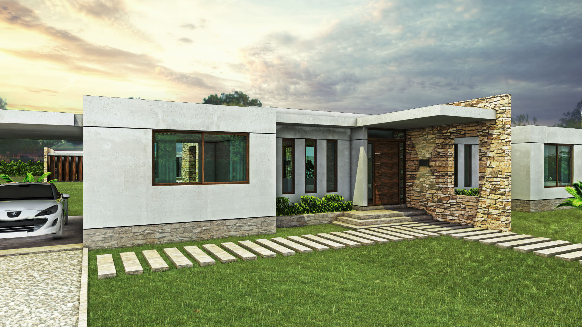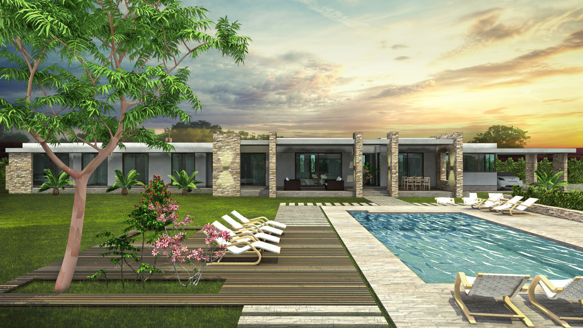 Je navržena na parcele 5000 m2 s dostatkem soukromí a velkorysými obytnými prostory, rozlehlými terasami, venkovní kuchyní, krbem, vířivkou, barem a tenisovým kurtem.